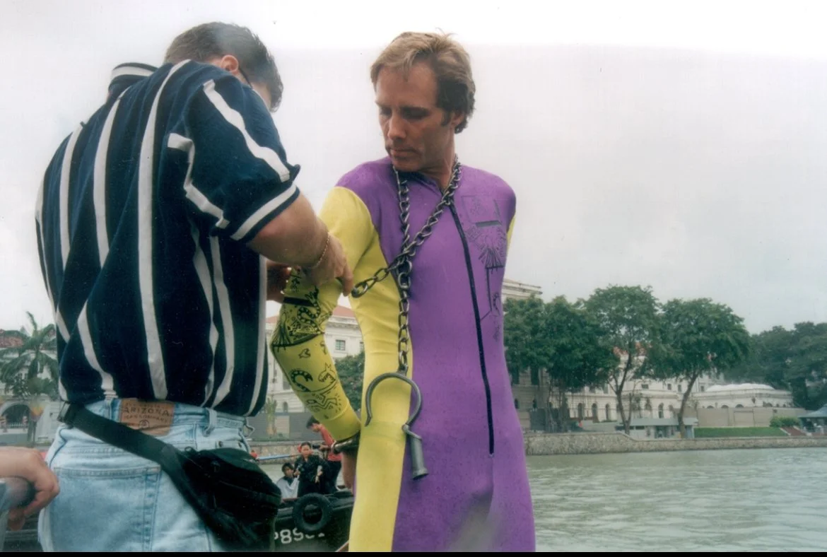 Escape Artist Michael Griffin getting locked up in handcuffs, chains and heavy cement block seconds before jumping to the bottom of the Singapore River